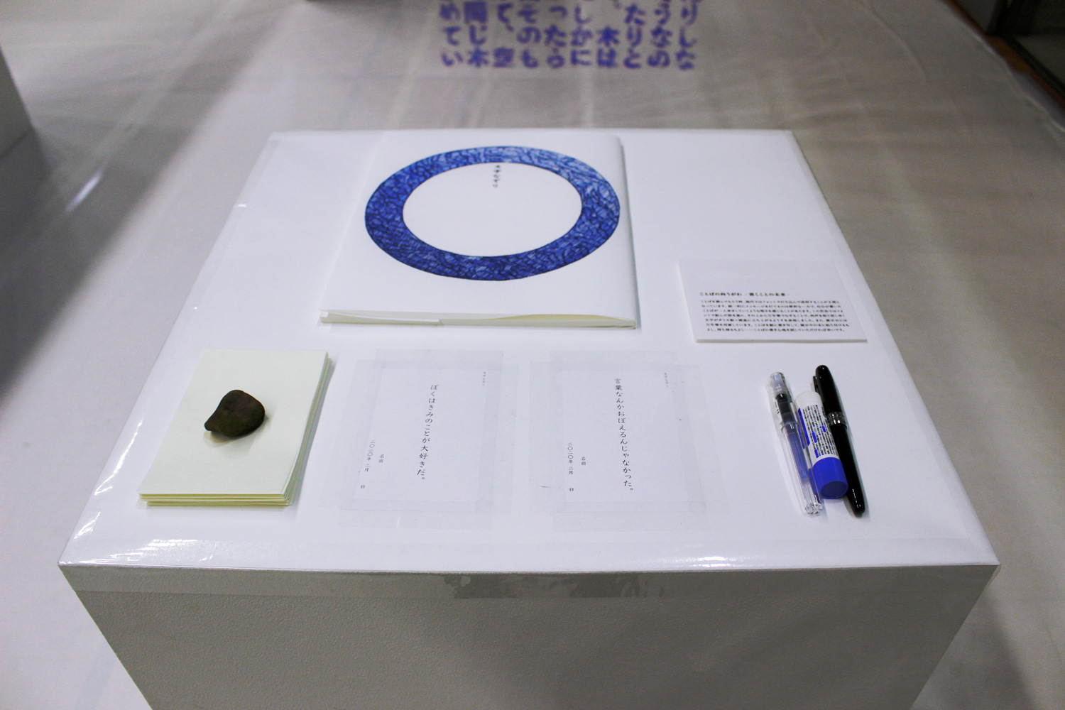 手書きの文字のよさを鑑賞者に実感してもらえるよう、中央の台に小さな紙を設置し、万年筆で書き込んでもらえるようになっています。
