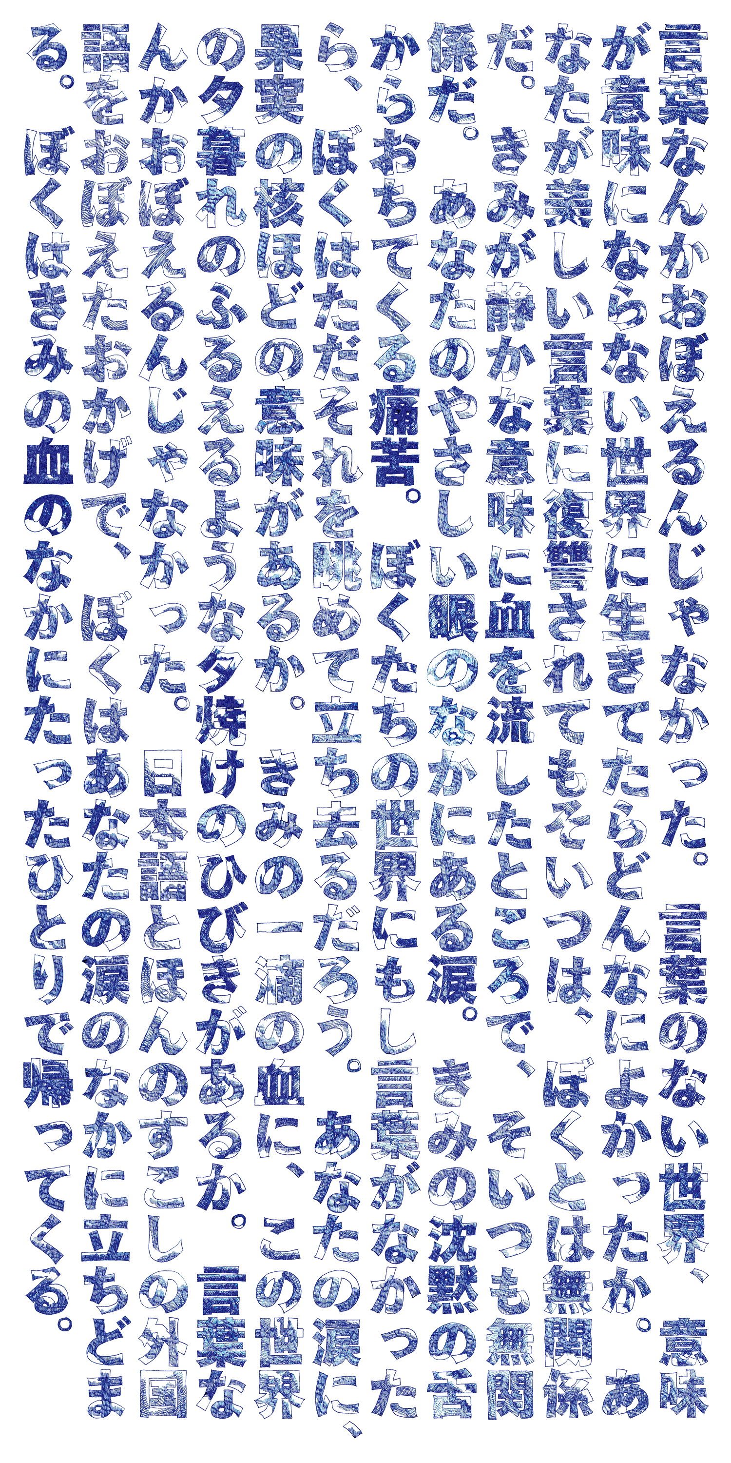 和紙のような質感の紙に、万年筆で1文字1文字手書きでハッチングしたものをスキャンし、空間に文字が浮かぶようポリカーボネートに特殊印刷しました。